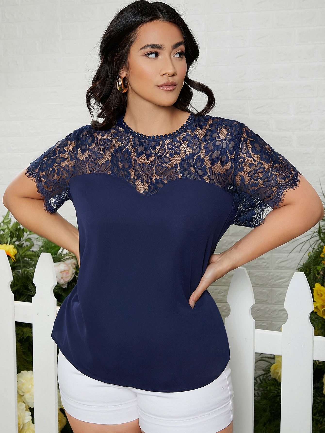 Plain Tie Back Short Sleeve Round Neck Long Plus Size Blouse
