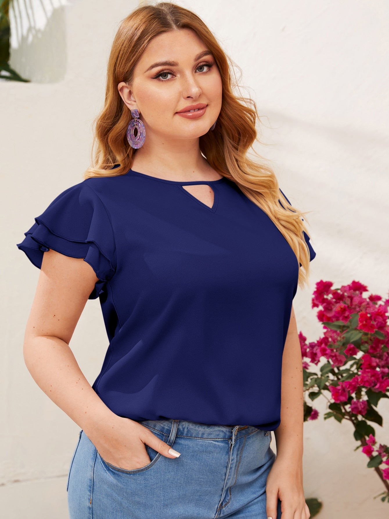 Plain Tiered Layer Cap Sleeve Keyhole Neckline Regular Plus Size Blouse
