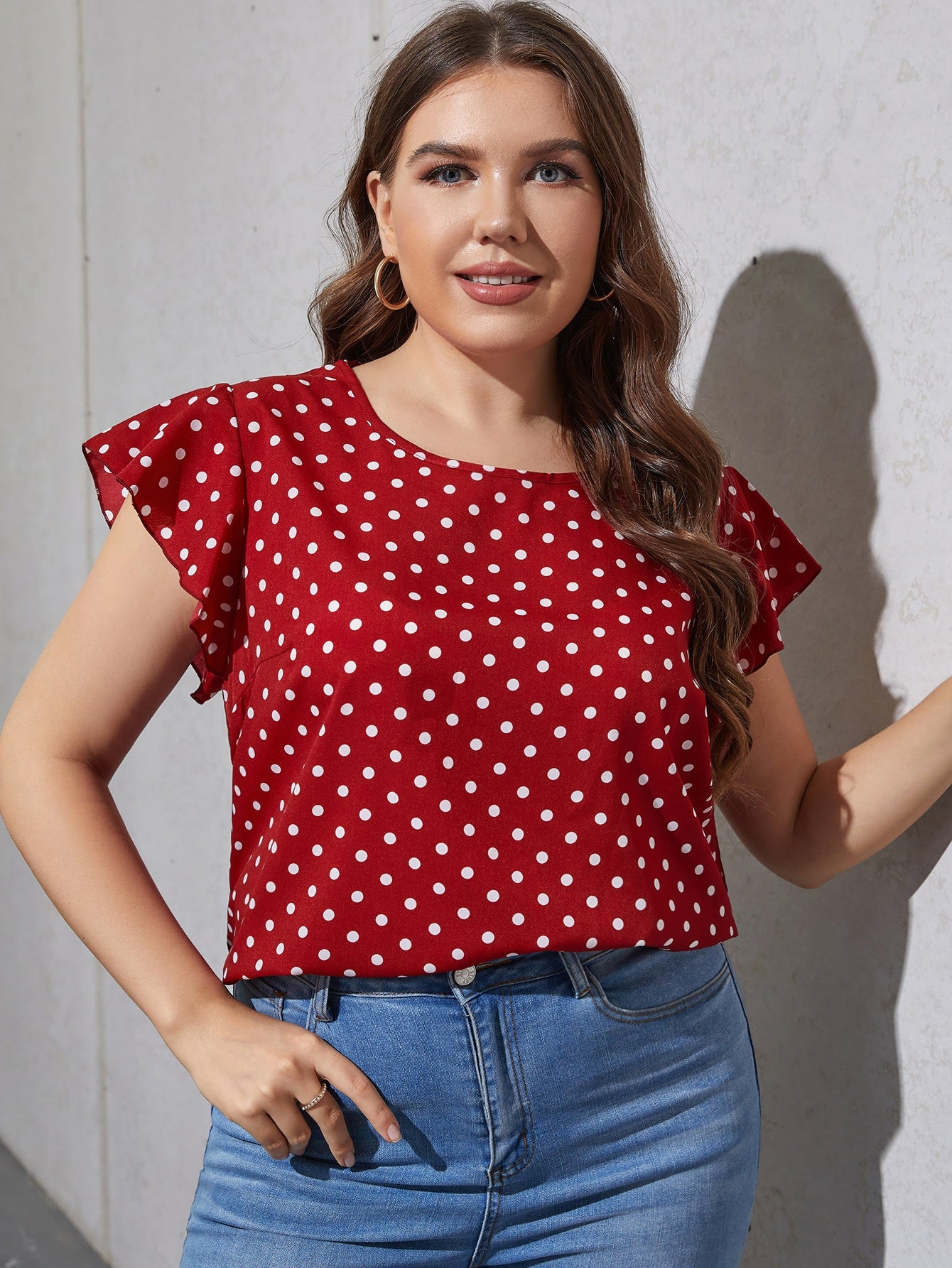 Polka Dot Ruffle Cap Sleeve Round Neck Regular Plus Size Blouse