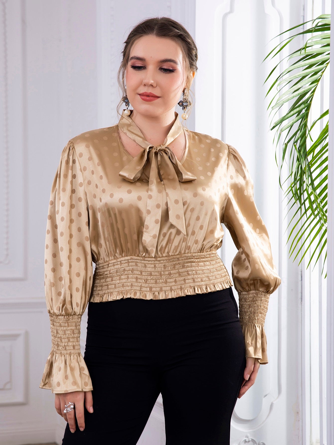 Polka Dot Tie Front Long Sleeve Tie Neck Regular Plus Size Blouse