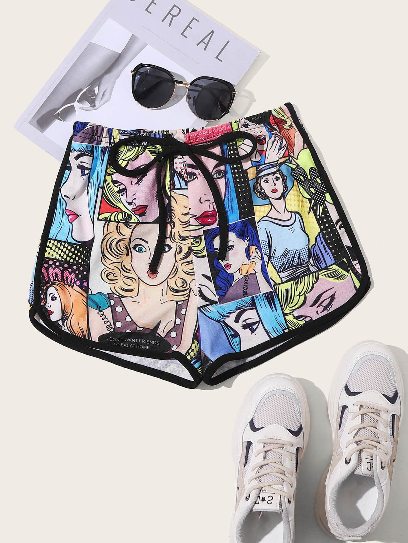 Sporty Pop Art Print Tie Front Natural Women Shorts