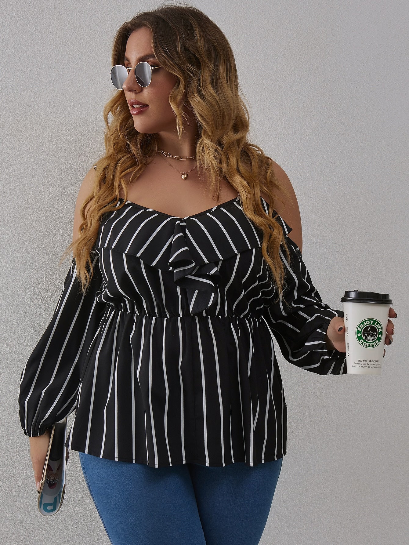 Striped Ruffle Long Sleeve Cold Shoulder Regular Plus Size Blouse