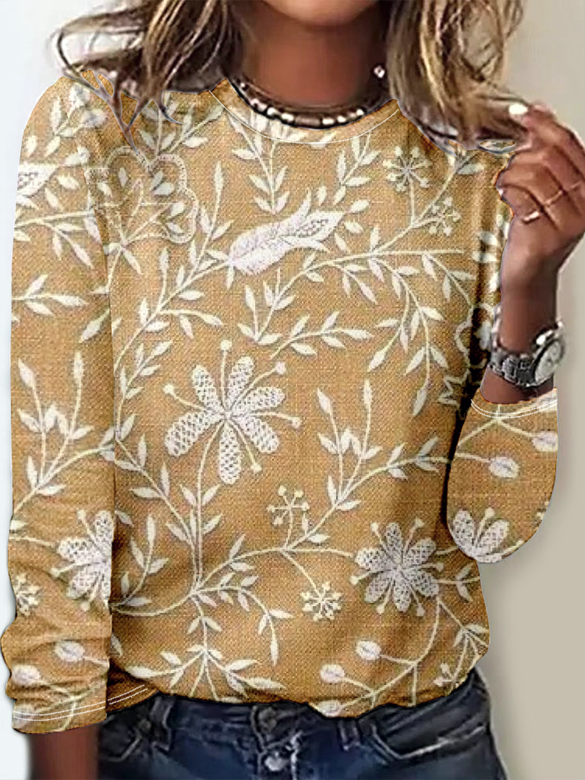 Vintage Long Sleeve Crew Neck 3D Printing Loose Regular T-Shirt