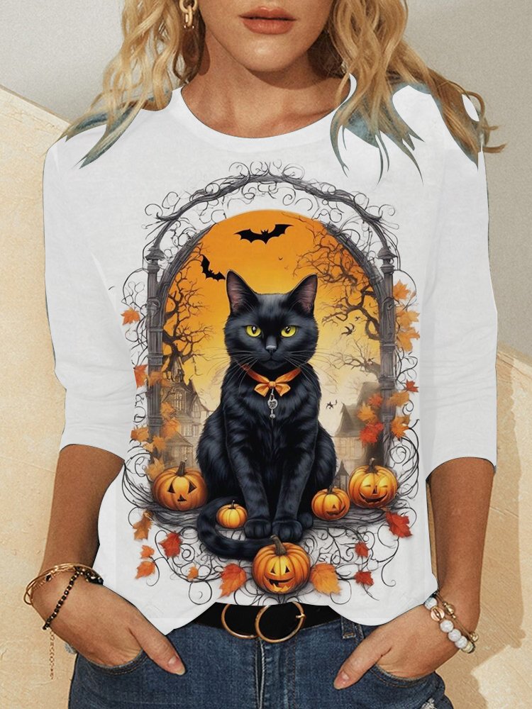 Vintage Long Sleeve Crew Neck Cat Loose Regular Blouse