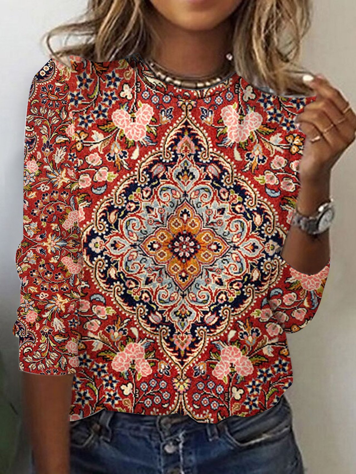 Vintage Long Sleeve Crew Neck Ethnic Loose Regular Blouse