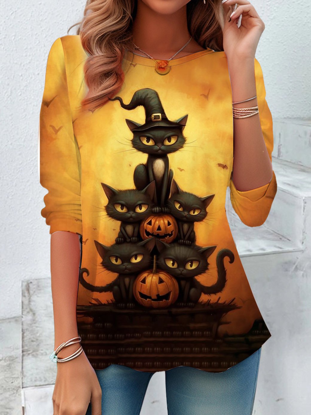 Vintage Long Sleeve Crew Neck Halloween Loose Regular Blouse