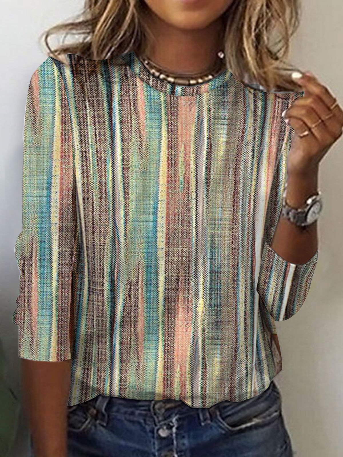 Vintage Long Sleeve Crew Neck Striped Loose Regular Blouse