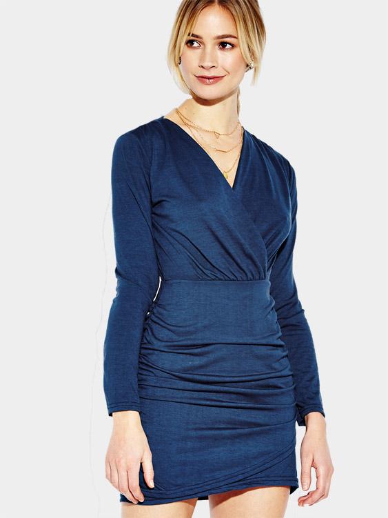 Wholesale Blue V-Neck Long Sleeve Bodycon Hem Dresses