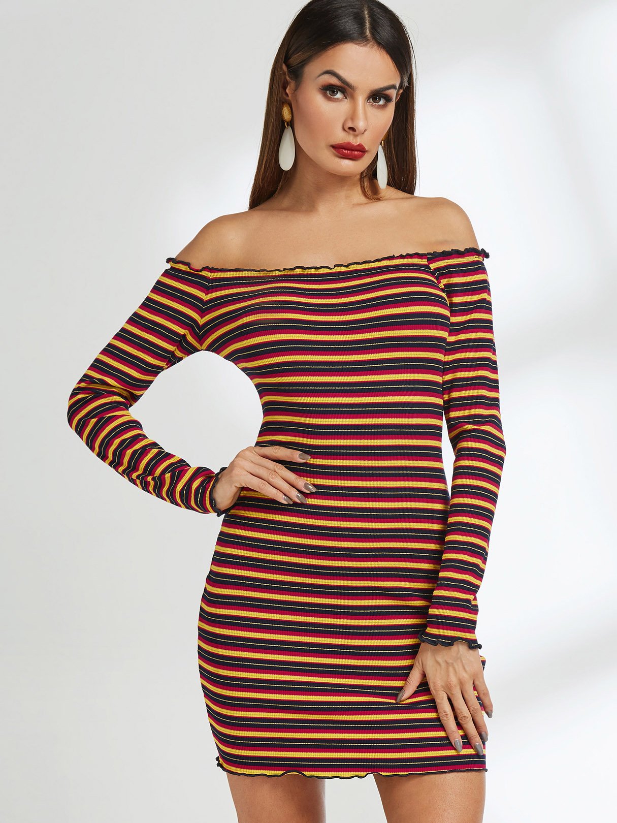 Wholesale Off The Shoulder Long Sleeve Stripe Dresses