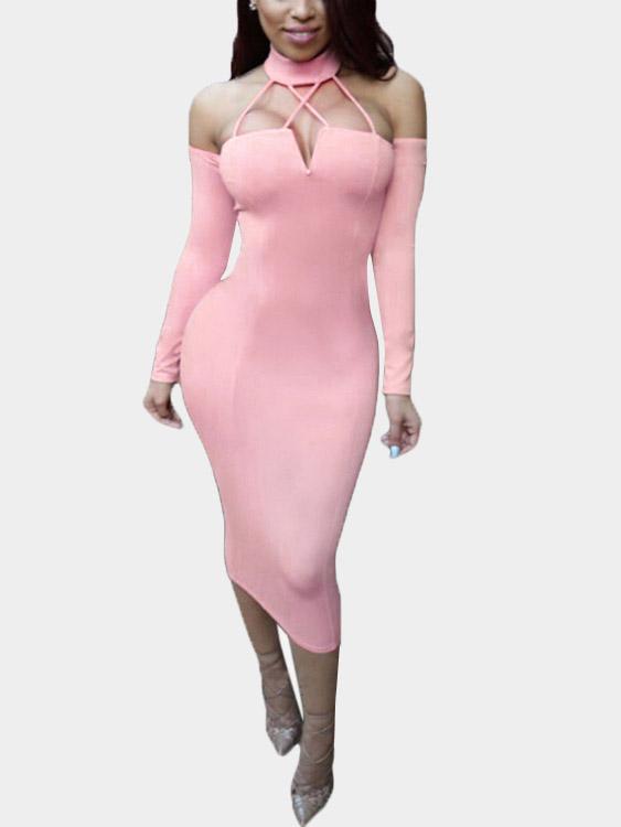 Wholesale Pink Halter V-Neck Long Sleeve Plain Backless Cut Out Dresses