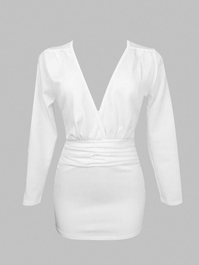 Wholesale White Deep V Neck Long Sleeve Pleated Wrap Bodycon Hem Dresses